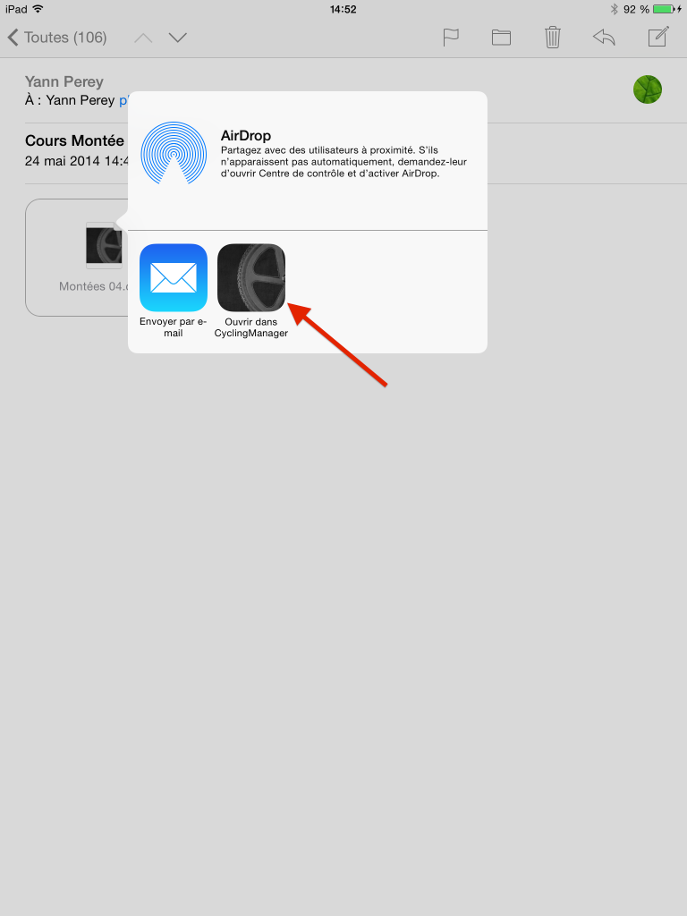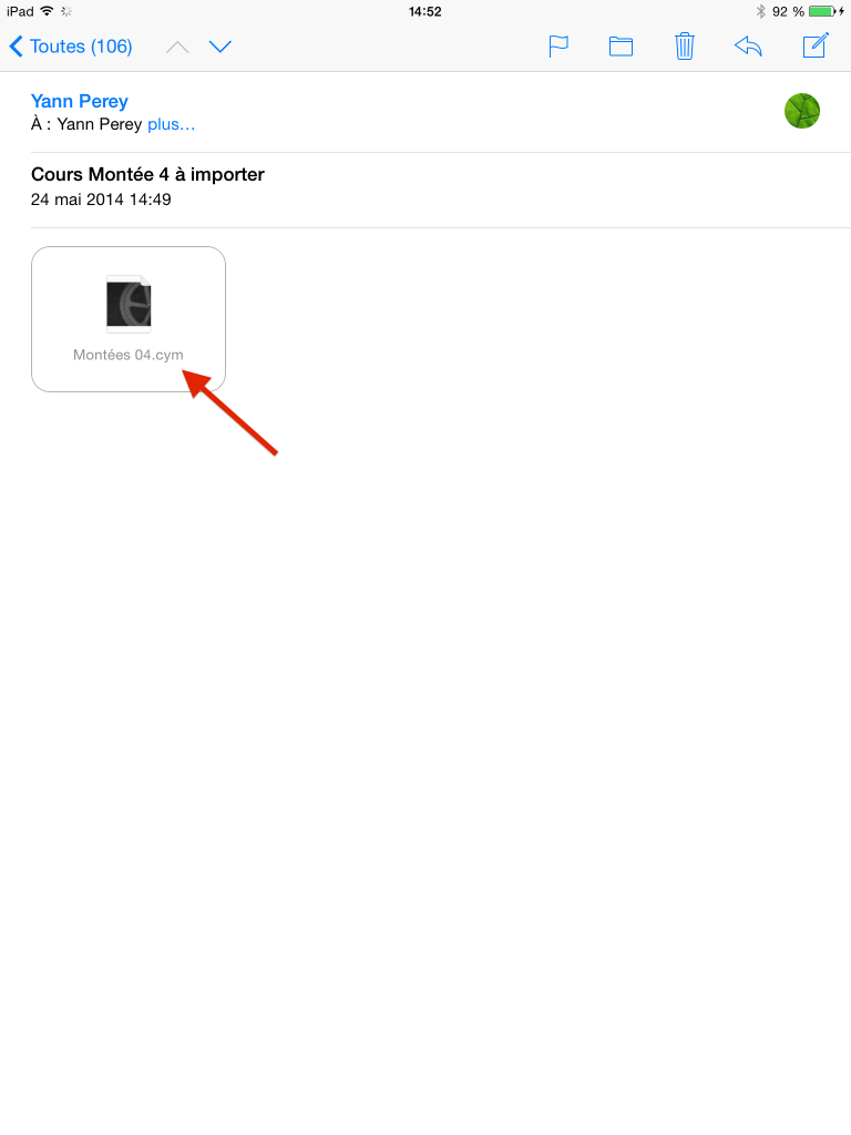 Pour ce faire, envoyez le fichier du cours à importer par mail à une adresse qui est configurée sur l’iPad et ouvrez le mail reçu depuis l’iPad (Figure 2.).