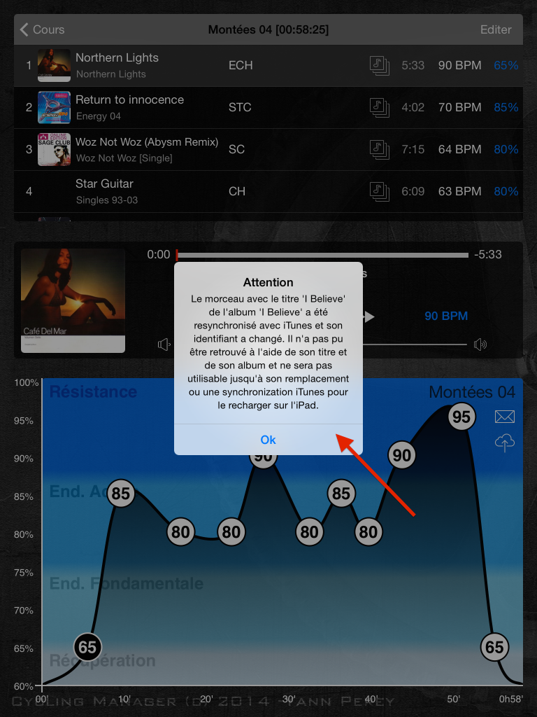 Il se peut qu’en souhaitant afficher le détail des morceaux du cours, vous ayez un avertissement vous indiquant que suite à une synchronization avec iTunes, un des morceaux présent dans le cours n’est plus sur l’iPad (Figure 7.).